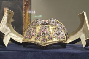 I gioielli in mostra sono meravigliosi. Spiccano dal fondo scuro delle teche e ci si ferma a guardarli in silenzio, come davanti a un dipinto. Sono opere d’arte e parlano da sole In esposizione ci sono esemplari dal Seicento all’Ottocento, in gran parte provenienti da una collezione privata siciliana. Sono opere realizzate dalle maestranze dell’Isola, tutte riconoscibili per stile e qualità, anche se i marchi compaiono soltanto dalla seconda metà del Settecento. A confronto, lungo il percorso, sono presenti anche opere provenienti da istituzioni museali e realtà ecclesiastiche come la Galleria Regionale della Sicilia di Palazzo Abatellis, il Tesoro della Cattedrale di Palermo, il Museo Regionale Agostino Pepoli, il Museo Diocesano di Monreale, l’Eparchia di Piana degli Albanesi, il Tesoro della Chiesa di Santa Maria a Randazzo, il Tesoro di Santa Venera ad Acireale e altre collezioni private siciliane, come quella degli orafi Fecarotta di Palermo. Il percorso espositivo, organizzato secondo criteri cronologici e tipologici, mette in luce il legame dell’oreficeria siciliana con quella spagnola tra XVI e XVII secolo e, dal Settecento, con quella francese. Un dialogo costante che non cancella mai l’identità dell’Isola, riconoscibile nella ricchezza della policromia, nella varietà delle forme e nella qualità delle lavorazioni.