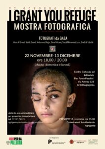 Dare voce e visibilità alle sofferenze e alle atrocità che il popolo palestinese sta subendo, nel silenzio assordante dei media occidentali, grazie alle straordinarie immagini fornite da sei fotografi della Striscia di Gaza. “I GRANT YOU REFUGE” (Ti concedo rifugio) è l’esposizione collettiva di 50 opere dei fotoreporter Jehad Al-Sharafi, Mahdy Zourob, Mohammed Hajjar, Omar Ashtawy, Saeed Jaras, Shadi AlTabatibi in rappresentanza delle decine di fotoreporter che vivono e lavorano in quel territorio come testimoni oculari di uno dei conflitti più devastanti del nostro tempo. La mostra, oltre ad Agrigento è stata in altre città italiane.