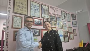 Nella foto, il presidente Piccillo assieme alla vicepresidente e allenatrice delle Aquile, Nunzia Rita Di Giglia, che ha illustrato passo passo la storia ultraventennale della squadra.»